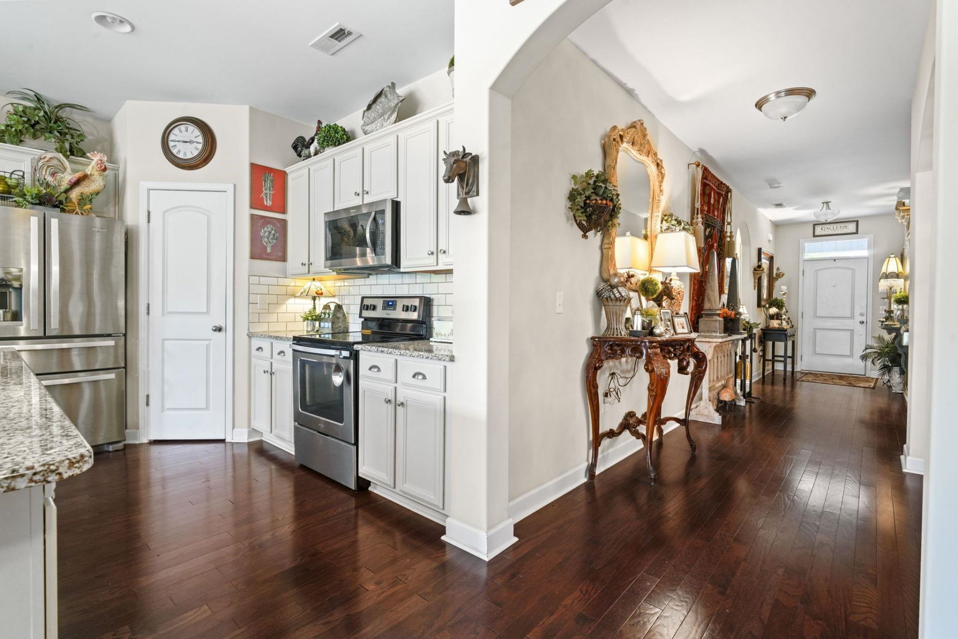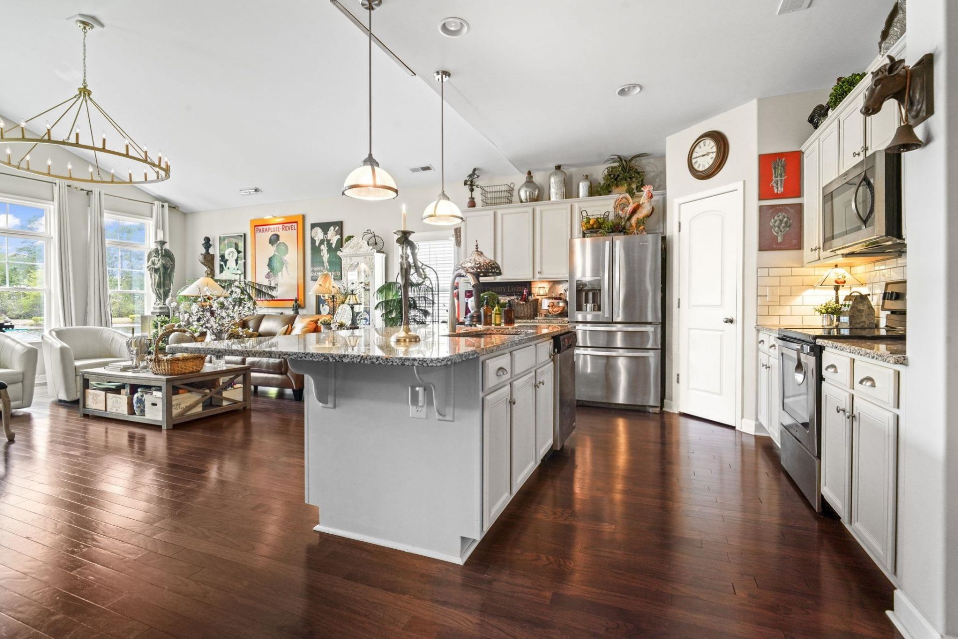 Designed by an interior designer, this stunning 3-bedroom, 2-bath single-story home is located in the exclusive Brookberry section of The Farman intimate enclave of just 55 homes built by RS Parker, known for its close-knit community feel. From the moment you arrive, the attention to detail is evident with lush landscaping, an irrigation system, and a beautifully tiled front entry. Inside, the foyer welcomes you with real hardwood flooring in a factory white oak French finish, setting the tone for the elevated design throughout. The home features a formal dining room with two statement chandeliers, a spacious laundry room, and a two-car garage. The main living area is filled with natural light from four tall windows showcasing serene pond and preserve views, complemented by vaulted ceilings and a striking bronze hanging light fixture. The kitchen is thoughtfully upgraded with the largest granite countertop offered by the builder, stainless steel appliances, updated fixtures and lighting, and an air purification system. The primary suite offers peaceful water views with additional windows creating a panoramic feel, along with a tiled step-in shower featuring safety handrails. Enjoy quiet mornings or relaxing evenings on the screened porch with a knee wall, overlooking a private backyard and natural surroundings. This one-of-a-kind home also offers access to community amenities including two pools, a playground, fitness room, and basketball court. Conveniently located just minutes from Tanger Outlets, dining, medical facilities, and everyday essentialsand only a short drive to the beach.