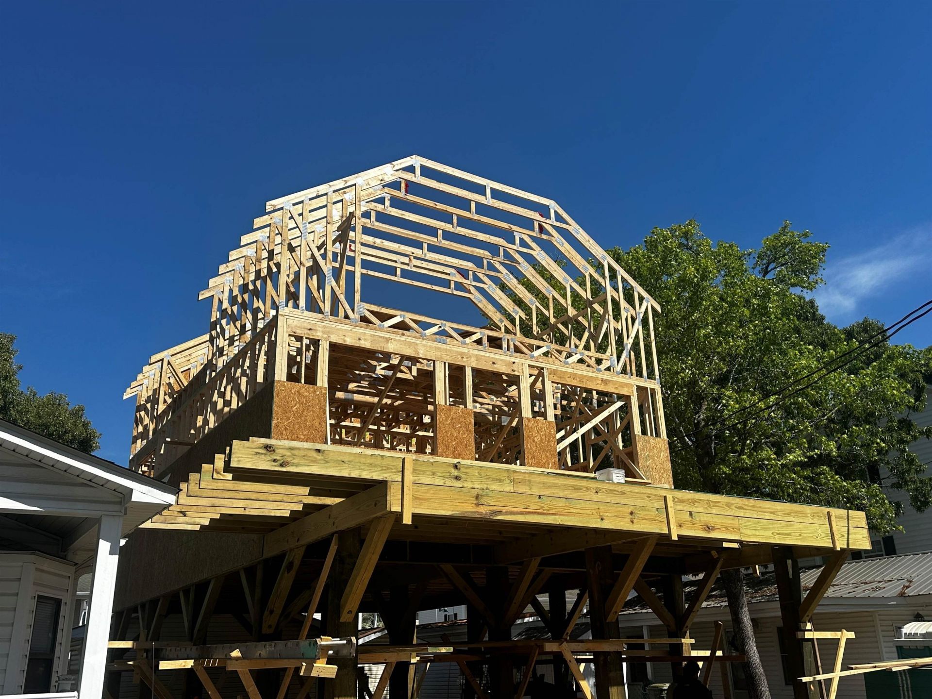 This 3-bedroom 3.5 bath NEW CONSTRUCTION with ELEVATOR will be a total of 1,425 sq ft over 2 floors. 1st floor will have living room, dining area, open concept kitchen with huge island. 1st floor primary bedroom with attached full bath. 1/2 bath is located downstairs and washer/dryer for added convenience. Upstairs has 2 more large bedrooms with attached full bathrooms! Hardie board and batten vinyl siding, custom cabinetry, built in closets, quartz countertops, full quartz backsplash, quartz bathroom vanities, CROWN MOLDING throughout, bullnose finish on drywall corners, spray foam insulated roof deck, black trim windows, trex decking, black aluminum handrails, LVP flooring, custom tile shower in primary bath with glass door, full tile surround in guest bath with soaker tub. LVP flooring will be Smartcore Lanier Hickory waterproof Luxury Plank Flooring. Stamped concrete, privacy louvers, 144 sqft garage, blacked out piers, Hardie board and batten vinyl sided outdoor shower with hot/cold water, trex ground decking, and MANY other upgrades! Completion date is 5/31/26.